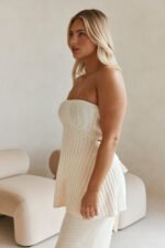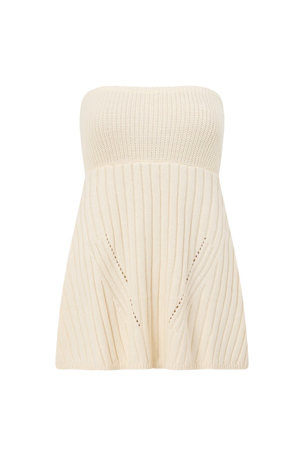Wear it as a set or style it your way. the Alice Top is made from a soft ribbed knit in a cream hue. It features a fitted bust panel with a strapless neckline. cutout detail at back. low slung back with tie detail. longline a-line hem and contrast size rib and contoured eyelet details throughout. Get the set with the Alice Pants. Designed exclusively by Sabo.
