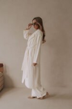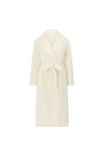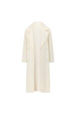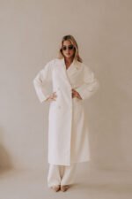 A classy way to stay warm. the Arabella Coat is made from a structured woven fabric in an off white hue. It features a wide collar and lapel. double breasted blazer opening. full length sleeves. large covered buttons. full length straight cut sleeves. longline hem and matching waist tie. Style with the Salma Pants. Designed exclusively by Sabo.