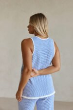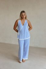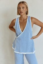 The ultimate chic and cosy set has arrived! The Billy Top is made from a natural cotton woven fabric in blue and white contrast stripes. It is a boxy style featuring a wrap panel at front with tie at side and longline hem. Get the look with the Billy Pants. Designed exclusively by Sabo.