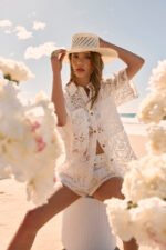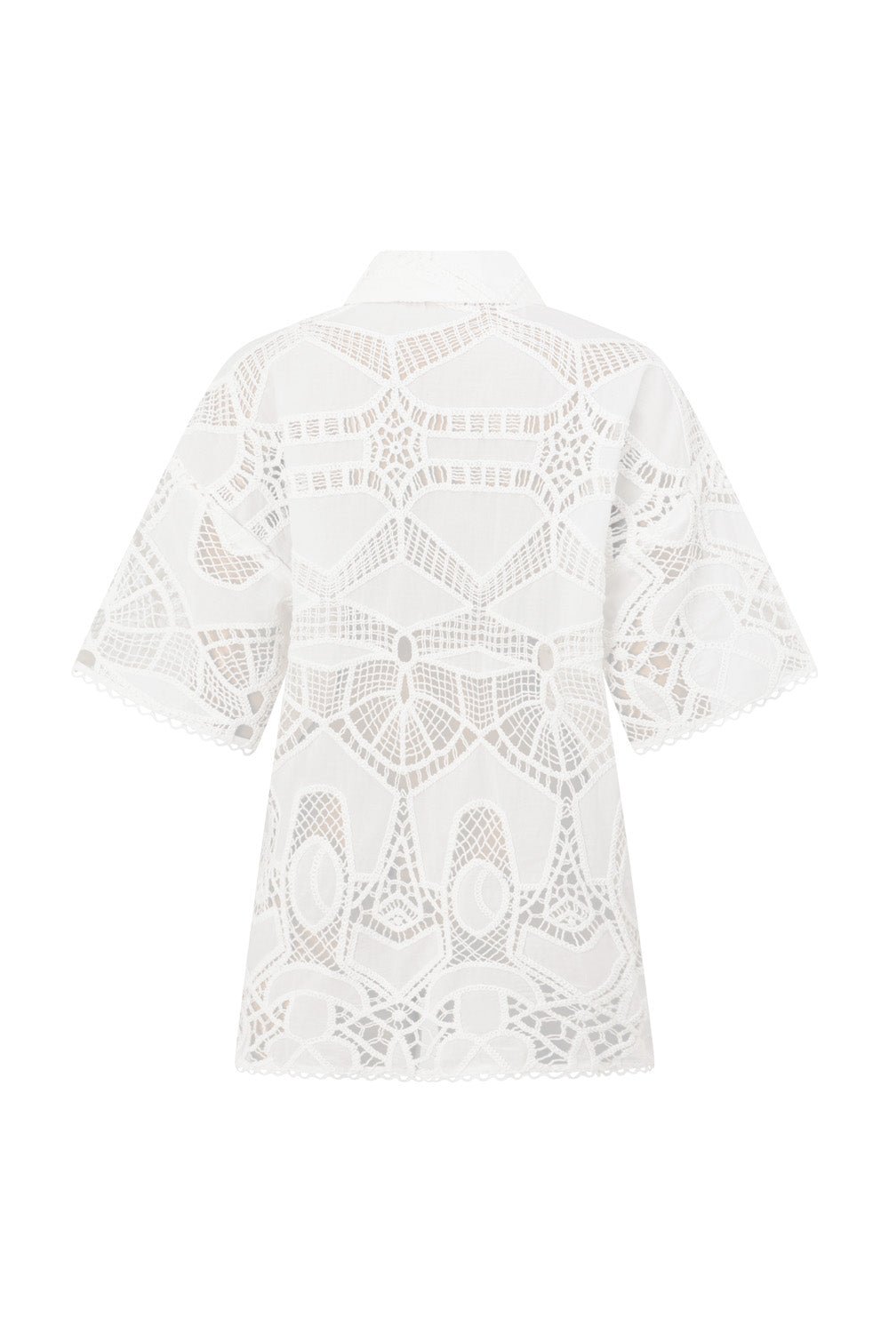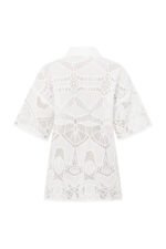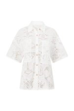 The Cielo Top in our delicate cutwork and embroidered fabric from our Resort ’25 collection. An unlined natural cotton oversized fit shirt with short boxy sleeves. collar and buttons at front. large patch pockets and loop trims throughout. Pair with the Cielo Shorts. Exclusive ZÃCO design.