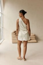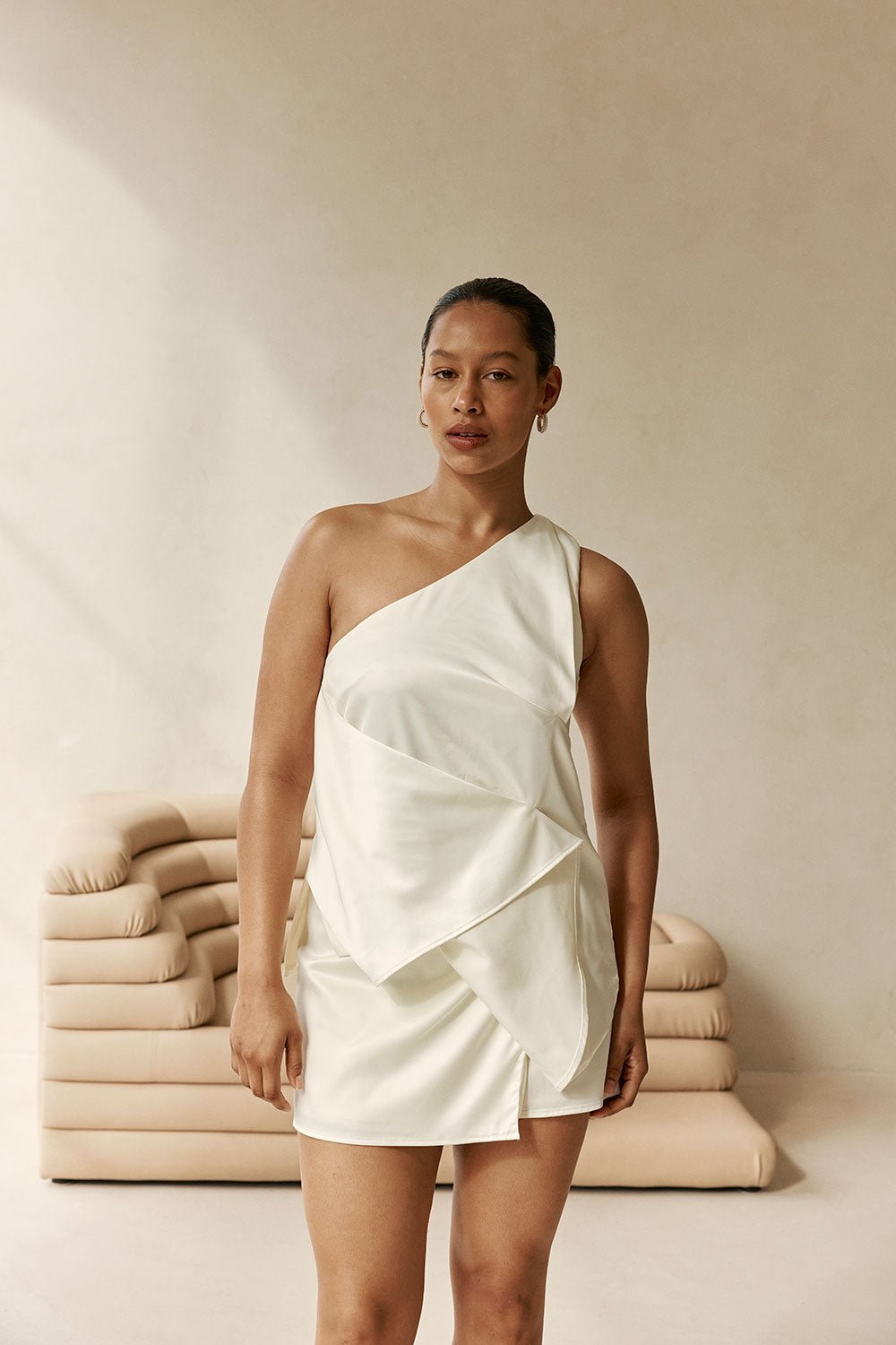 A chic. structured set perfect for date night! The Dusk Top is made from a suiting fabric in an off white hue. It features an asymmetric neckline with wide strap. folded details and an asymmetric hem. Pair with the Dusk Skirt and Tamia Heels! Designed exclusively by Sabo.