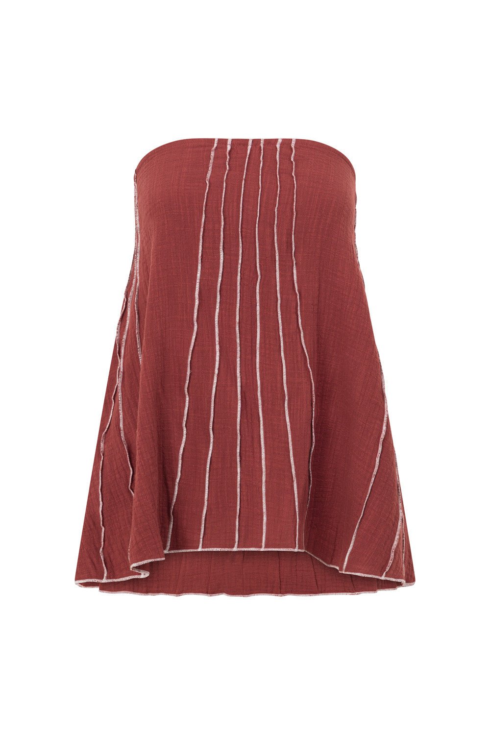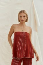 Inspired by feminine curves. designed to flatter. The Emilia Top is made from a natural cotton fabric in a deep red hue. It features a fitted strapless neckline. flouncy a-line hem and contrast white contour and trim panels throughout. Get the set Emilia Pants. Designed exclusively by Sabo.