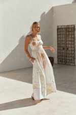 Perfect for an event or a long lunch. the feminine Genevieve Dress is made from a natural linen cotton blend fabric with our exclusive Vintage Bloom print. It features adjustable bind straps. contrast baby blue bind trims and panels. fitted bust and waist and a gathered flouncy maxi skirt. Dress it up with the Tamia Heels. Designed exclusively by Sabo.
