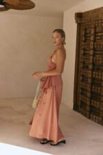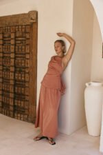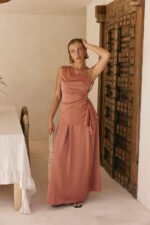 Step into your next event in style with the Hailey Top. made from a matte silky fabric in a musky coral hue. It features an asymmetric neckline with single thin strap. low scooped back. gathered panel at side waist and drape detail at side hem. Get the set with the Hailey Skirt! Designed exclusively by Sabo.Â
