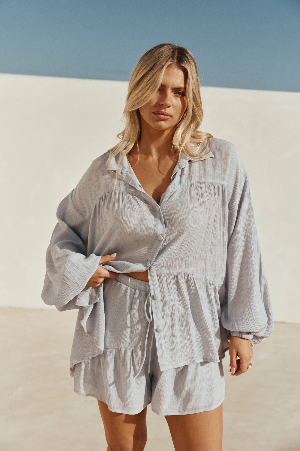 With the Sabo signature essence. the Huxley Shorts are your next go-to staple! They are made from a lightweight rayon blend crepe fabric in a soft blue hue and feature a high elasticated waist with drawstring and flouncy tiered fit. Get the look with the Huxley Top! Designed exclusively by Sabo.