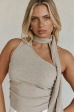 An elevated styling piece. the Mourno Top is made from a soft ribbed fabric in a beige hue. It features a one shoulder asymmetric neckline with a long attached collar detail and ruching details at sides for a flattering fit. Style with the Amera Pants. Designed exclusively by Sabo.