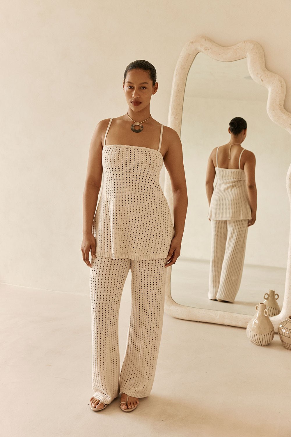 Wear it as a set or pair it with bikinis! The Nev Pants are made from a natural cotton crochet fabric in a beige hue. They are a high waisted style featuring an elasticated waist and relaxed fit. Get the set with the Nev Top! Designed exclusively by Sabo.