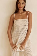 A classic design in a fun knit fabric! The Nev Top is made from a natural cotton crochet knit in a beige hue. It features thin bind straps. straight neckline. a-line hem and ribbed trims. Complete the look with the Nev Pants! Designed exclusively by Sabo.