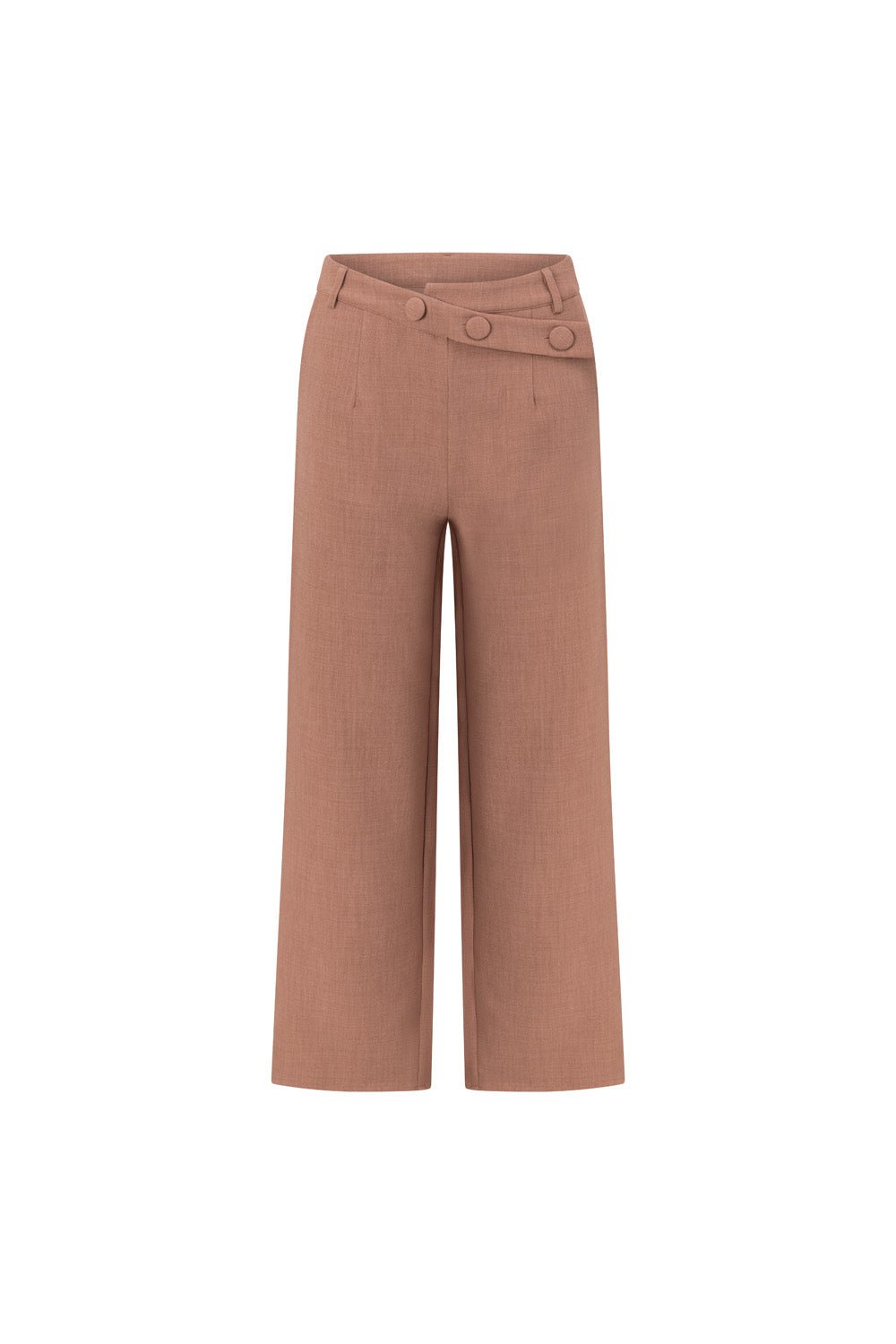 Wear it as a set or style it back with a button up shirt or tank! The Raven Pants are made from a structured suiting fabric in a tan hue. They are a high waisted style featuring an asymmetric covered button and waist band detail and a relaxed fit. Get the look with the Raven Top. Designed exclusively by Sabo.