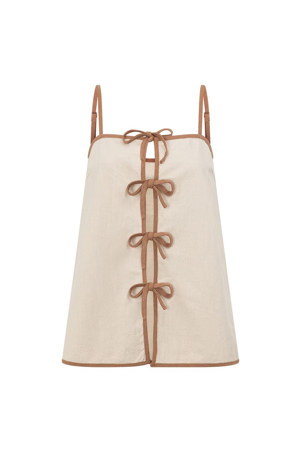 A flattering set and versatile easy to style stand alone piece. the Rosalina Top is made from a natural ramie cotton fabric in a beige hue. It features contrast bind trims. adjustable straps. split at centre front with tie details and a longline hem. Get the set with the Rosalina Shorts and Deka Sandals! Designed exclusively by Sabo.