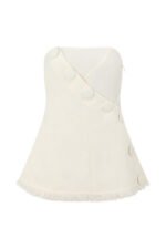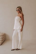 Bold. structured and made to flatter! The Salma Top is made from a woven structured fabric in white. It features a strapless neckline. fixed wrap with large covered button details. longline a-line hem and raw frayed hem. Style with the Salma Pants. Designed exclusively by Sabo.