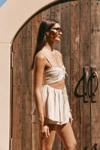A super cute set and perfect layering styling piece! The Sydney Top is made from a high quality natural cotton linen blend fabric in a beige hue. It features adjustable bind straps. curved cropped bust with pleated detailing and functional rouched tie. cutout at waist. longline pleated top with split at front and tie closure. Get the set with the Sydney Shorts! Designed exclusively by Sabo.