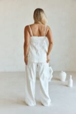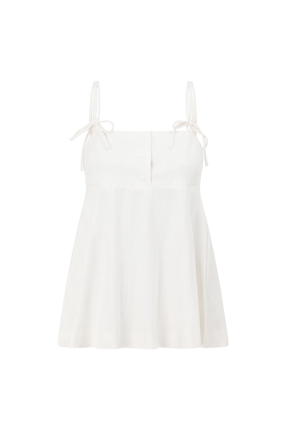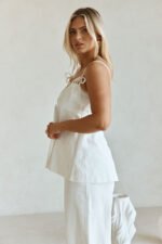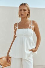Wear it as a set or style it with a mini skirt! The Tilda Top is made from a structured cotton fabric in white. It features twin double rouleau straps with tie details. button down closure at bust and an a-line hem. Complete the look with the Tilda Pants. Designed exclusively by Sabo.